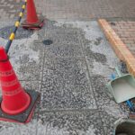 お墓の据え付けが完了しました! これから目地入れに入ります。きれいに目地を入れられるようにマスキングして養生しています。とても暑い日で急な雨も心配だったので、目地入れの前にテントを張っておきました。